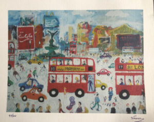 Simeon Stafford was born in 1956 in a small town in the North of England. He met L S Lowry at the age of 14, who became a family friend and encouraged him to paint. The influence and inspiration of Lowry is obvious from Stafford’s naïve, figurative style. Like Lowry, his paintings are observations of humans in their daily lives, but the scenes are always vibrant with colour, and often reflect the excitement and happiness of children.