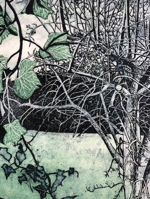 Striking winter image in tones of green and blue contrasting ivy leaves with the bare tree.
